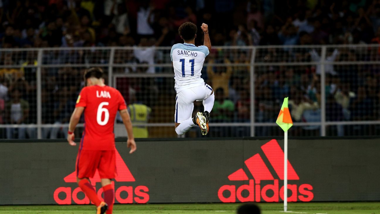 Jadon Sancho's brace and a late goal from substitute Angel Gomes guided England to a 4-0 win over Chile in Group F.