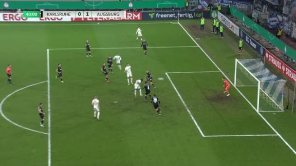 Samuel Essendre scores a beautiful header goal to the near post in the first half to give FC Augsburg a 1-0 lead vs. Karlsruher SC.