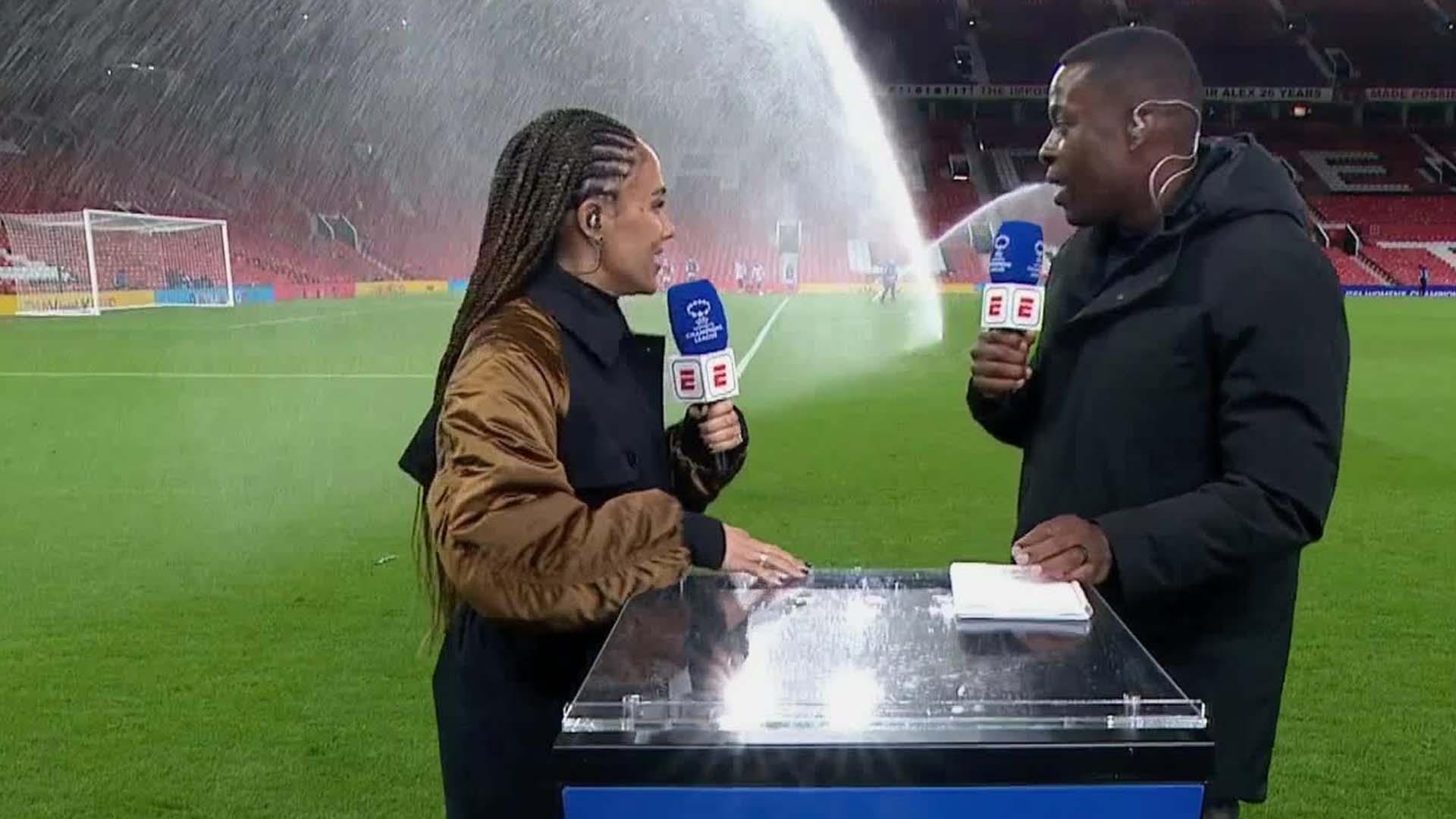 Alex Scott and Nedum Onuoha are interrupted by sprinklers during half-time of Manchester United vs. Bayern Munich in the Women's Champions League.