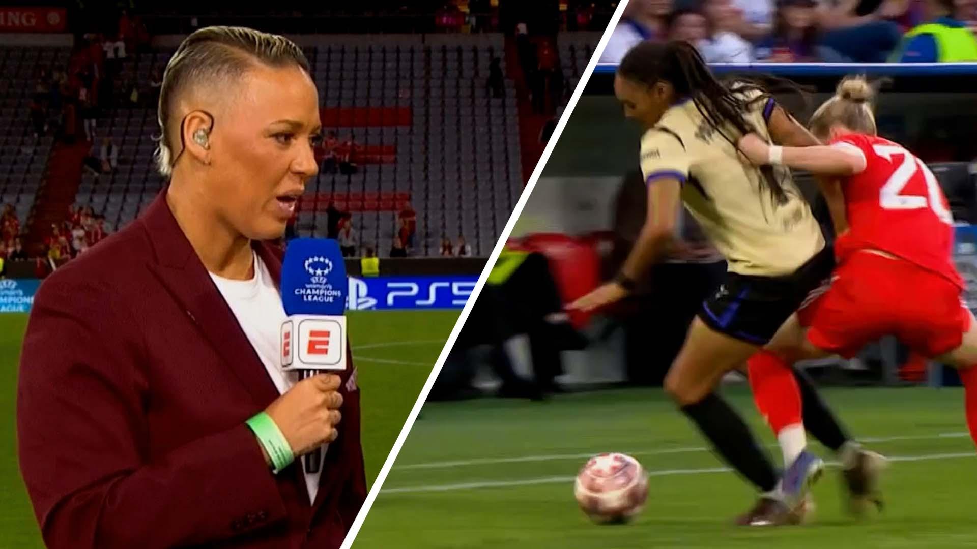 Lianne Sanderson reacts to Franziska Kett red card for a hair pull during Bayern Munich vs. Barcelona in the Women's Champions League.